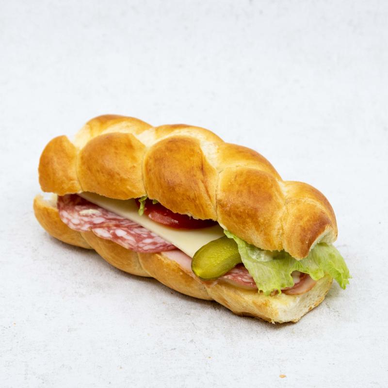 Weizenmehl, Wasser, Hinterschinken (Schweinefleisch (CH), Wasser, Nitritpökelsalz (Kochsalz, Konservierungsmittel: E250), Stabilisator: E450, Stabilisator (Triphosphate), Antioxidationsmittel (Natriumascorbat, Natriumcitrate), Würze, Dextrose, Gewürzextrakt), Mammutkäse (Milch, Milchsäurebakterien, Labstoff), Tomaten, Salami (Schweinefleisch (CH), Speck (CH), Rindfleisch (CH), Schwarten, Nitritpökelsalz (Kochsalz, Konservierungsstoff: E250), Maltodextrin, Aroma, Gewürze, Traubenzucker, Zucker, Antioxidationsmittel (Natriumascorbat), Konservierungsstoff: E252), Käsereibutter, Sonnenblumenöl, Vollei, Eier, Cornichons, Milchbackmittel (Buttermilchpulver, Molkenpulver, Laktose), Salz, Backhefe, Trockenvorteig (Weizenmehl, Roggenmehl, Enzyme), Senf mild, Eigelb, Kräuteressig (Konservierungsmittel (Kaliummetabisulfit)), Zucker, Backmalz flüssig (Gerstenmalz, Gerste, Wasser, Dextrose), Pfeffer weiss, Zitronen, Eisbergsalat