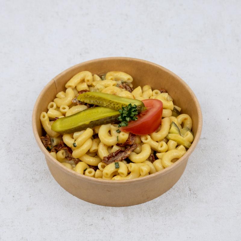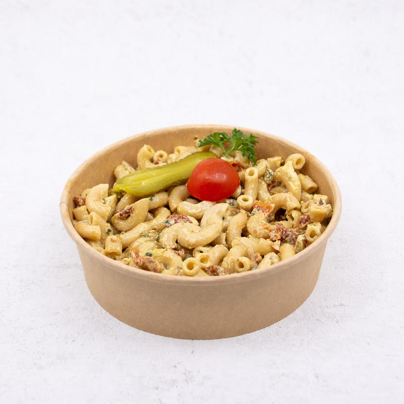 Wasser, Dinkel Hörnli (EIER* (Schweiz). *aus Freilandhaltung., URDINKEL-MEHL (Schweiz)), Condimento Balsamico Bianco (Weissweinessig, konzentrierter Traubenmost, Antioxidationsmittel: KaliumdiSULFIT.), Essiggurken (Gurken, Branntweinessig, Speisesalz, Zucker, Gewürze (enthält SENFKÖRNER), Konservierungsstoff (Natriumbenzoat, Kaliummetabisulfit), Kräuter, natürliches Aroma, Zwiebel, Curcumaextrakt. Vegetabil.), Tomaten, Cornichons (Gewürzgurken (EU), Branntweinessig, Zucker, Salz, Gewürzextrakt, Antioxidationsmittel (E224)), Senf mild, VOLLEI (Eier aus Bodenhaltung), Speisesalz (Sulfat), Basilikum Mise en place, Petersilie, Kräuteressig, Schnittlauch, Speisesalz jodiert, Säuerungsmittel (E330), Zitronen, Pfeffer weiss, Sonnenblumenöl